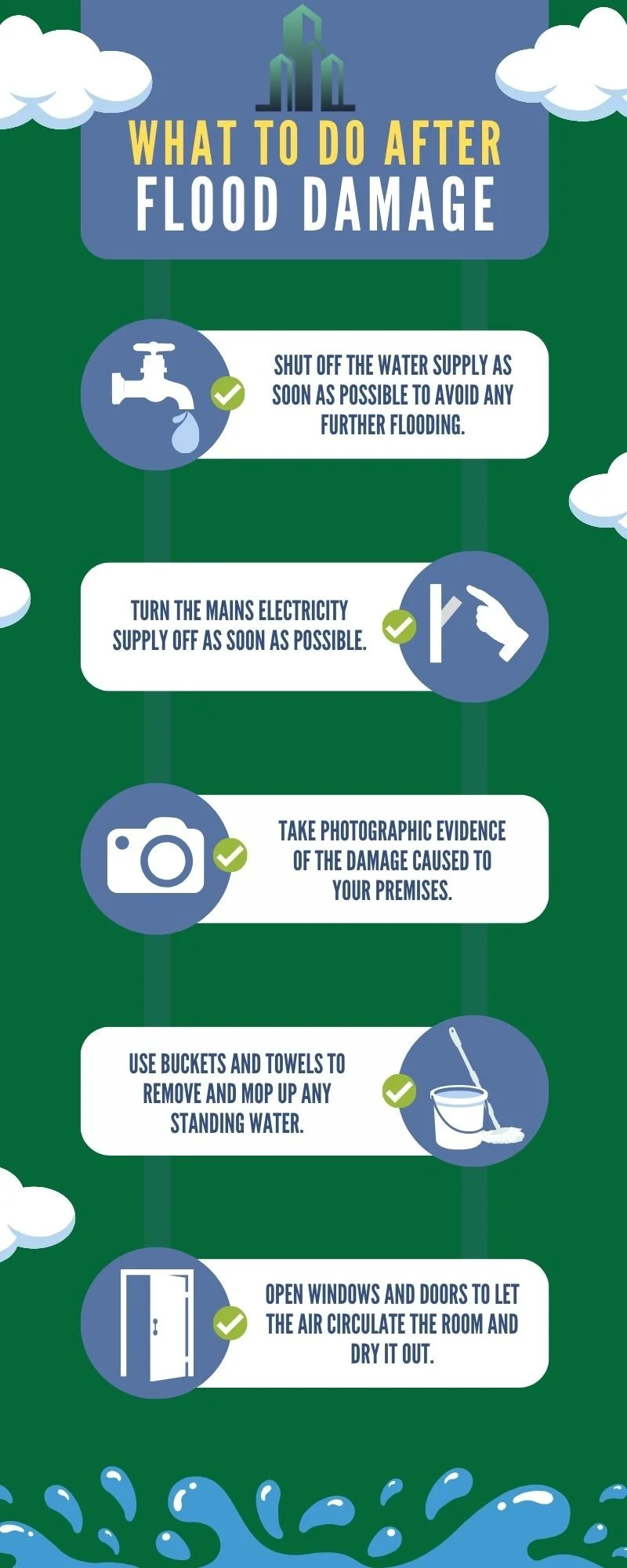 Infographic illustrating steps to take after flood damage, including shutting off the water supply, turning off electricity, taking photographic evidence, mopping up standing water with buckets and towels, and opening windows for ventilation. Designed for San Diego homeowners dealing with water restoration needs.